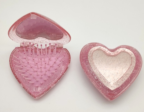 Cepillo de pelo portátil personalizado con forma de corazón, cepillo de pelo plegable ABS con espejo
